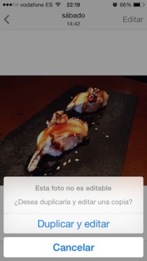 - En algunos casos en los que una foto no sea editable (no sabemos muy bien con qué motivos), nos aparecerá un mensaje avisándonos de ello y preguntándonos si queremos duplicar la foto para editarla.