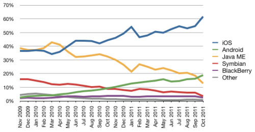 En comparación, aún tenemos a iOS totalmente destacado, pero también vemos (como es totalmente lógico), ganando cuota de mercado a Android mientras que Symbian y BlackBerry siguen perdiendo usuarios.