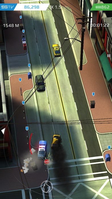 Manteniendo su original y sencillo control en el que solo tendremos que mover el dedo por la parte inferior de la pantalla para girar el coche, nos encontramos con un juego gráficamente destacado, en el que tendremos que intentar llegar lo más lejos posible, esquivando (o destrozando) a los coches policía, ya sea mediante coche o barco y cumpliendo varias misiones para ganar puntos y dinero extra.