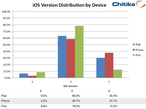 Por parte del iPad, sigue de cerca a los iPhone con el 30,3%. El cambio al nuevo sistema está siendo más sosegado, pero la tendencia es que pronto será igual la cantidad de iPad’s y iPhone’s con iOS 5.