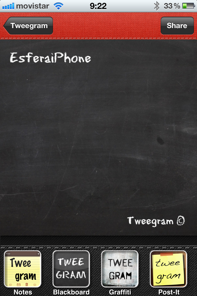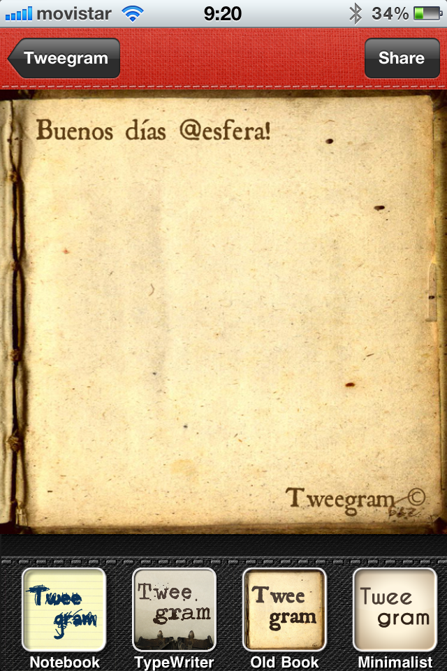 Hoy os traemos una opción más para ‘twittear’ de una forma vistosa a través de Instagram u otras apps. Su uso es muy sencillo: sólo hay que escribir algo, escoger la plantilla (del mismo modo que lo hacemos con Instagram) y exportarla a dicha aplicación de fotos u otras compatibles, como Camera+, Dropbox o WhatsApp.