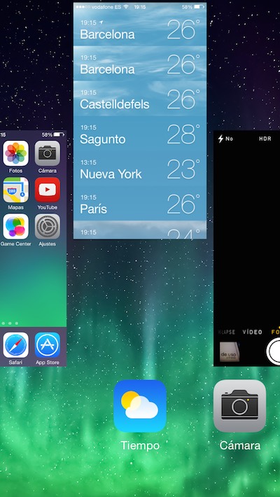 - Para acceder a la multitarea solo tenemos que pulsar dos veces el botón Home. Desde allí veremos en forma de captura de pantalla todas las apps abiertas. Para cerrar una solo tenemos que «tirarla» hacia arriba.